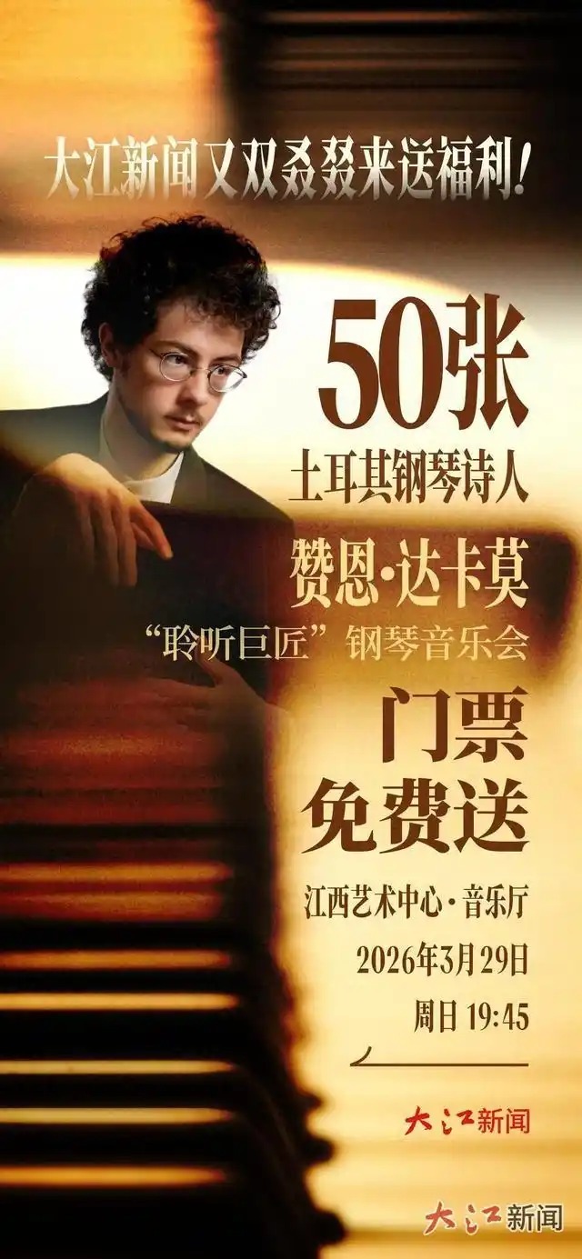 不想错过这场钢琴盛宴?机会来了!大江新闻联合江西文演院线送出50 张赞恩・达卡莫 “聆听巨匠” 钢琴音乐会门票,3月29日可使用,一人 2 张,可携亲友共赴,沉浸式感受国际大师的指尖魅力,高雅艺术盛宴!